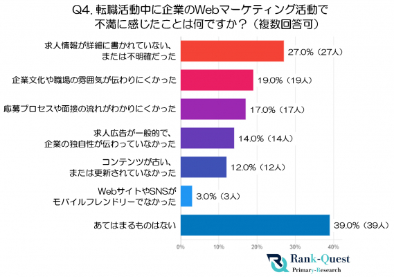 一方で、不満点としては「求人情報が詳細に書かれていない、または不明確だった」が27.0%(27人)で最も多く、応募判断に必要な情報が不足していることが課題として浮かび上がっています。