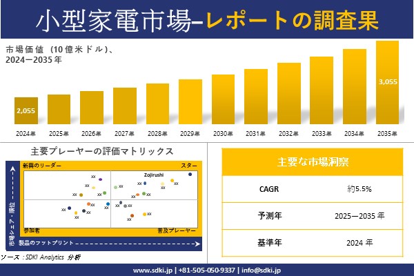 SDKI Analytics(本社:東京都渋谷区)は、このたび、2025年10月06に「小型家電市場調査レポート:2025−2035年の市場規模、シェア、傾向の予測」を発表しました。小型家電に関する市場調査レポートには、統計的および分析的アプローチを使用した予測評価が含まれています。この調査レポートでは、一次および二次調査方法を使用して分析された主要な業界洞察を通じて将来の傾向を理解できるようにすることで、主要な市場動向を読者に説明しています。