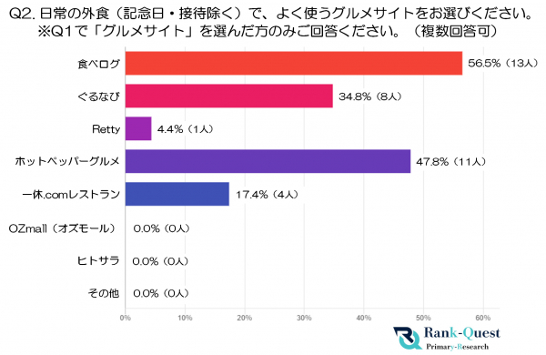 2.日常の外食(記念日・接待除く)で、よく使うグルメサイトをお選びください。※Q1で「グルメサイト」と回答した人が対象(複数回答可:注2)