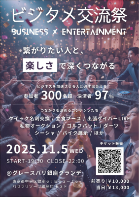 『ビジタメ交流祭』は、単なる名刺交換の場に留まらず、体験やエンターテイメントを通じて関係構築と具体的なビジネスアイデアの発想までを目指す、新しい形のビジネス交流イベントです。