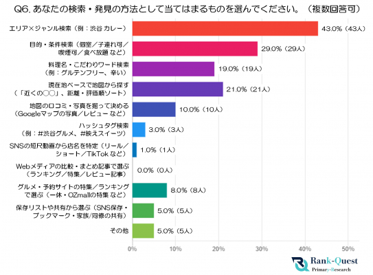 一方で、「SNSの短尺動画から店名を特定」1.0%(1人)、「ハッシュタグ検索」3.0%(3人)など、SNSを軸にした検索はごく少数に留まり、検索エンジンや地図サービスを中心にした情報収集スタイルが主流であることがわかります。