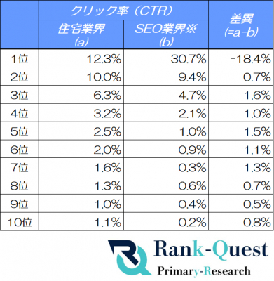 今回のデータでは、住宅業界における1位のクリック率は12.3%となり、SEO業界の30.7%と比べて約18ポイント低い水準となりました。