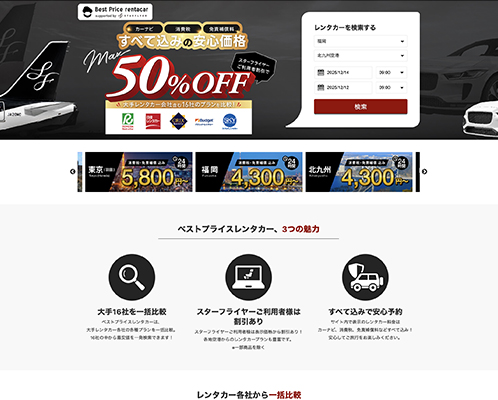 株式会社フラッシュエッヂ(以下フラッシュエッヂ、代表取締役:知名 健一、本社:沖縄県那覇市)と株式会社スターフライヤー(以下スターフライヤー、代表取締役 社長執行役員:町田 修(まちだ おさむ)、本社:福岡県北九州市)は共同でスターフライヤーご利用のお客様向けにレンタカーの比較・予約サービス「Best Price Rentacar(ベストプライスレンタカー)」を2025年12月22日に開始いたしました。本サービスは、全国のレンタカー会社から厳選した16社以上のプランを一括比較・予約する事ができ、スターフライヤーをご利用のお客様は、さらにお得な価格でレンタカーをご利用いただけます。------------------------------------------------------------------