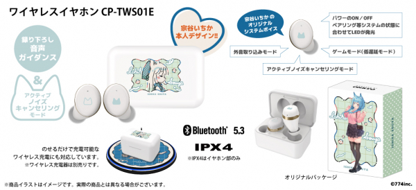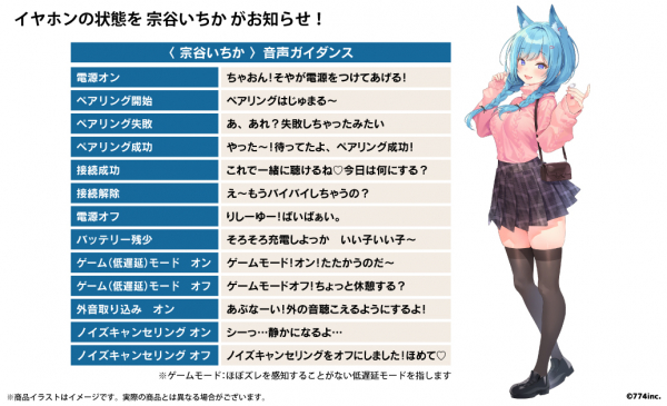 本コラボレーションモデルは、左右のイヤホンや充電ケースを「宗谷いちか」本人がデザインした柄を本体にあしらい、白を基調とした普段使いがしやすい商品となっております。また内蔵されているボイスは完全録り下ろし(全13ワード)です。パッケージには、本コラボレーションモデルのために撮り下ろされた「宗谷いちか」のビジュアルを採用しています。