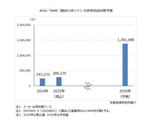 【矢野経済研究所プレスリリース】AGV/AMR世界市場に関する調査を実施(2025年)〜2030年のAGV/AMR世界出荷台数を約138万台に拡大予測、産業現場における生産・物流スマート化が加速〜