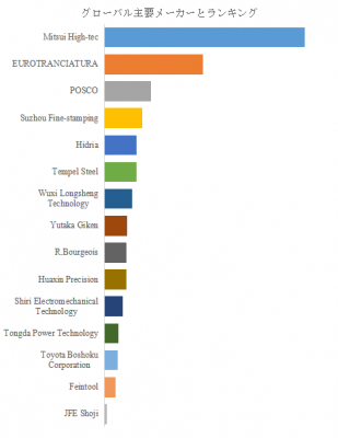 市場をリードするのは、日本のMitsui High-tec、欧州のEUROTRANCIATURA、韓国のPOSCO、中国のSuzhou Fine-stampingなどである。Mitsui High-tecは高精度プレス技術と積層コア製造の自動化で高効率モーター向けに優位性を確立しており、グローバルOEMとの連携を強化している。EUROTRANCIATURAは欧州電動化需要に対応した軽量薄板技術を展開し、POSCOは高磁束密度を実現する先進電磁鋼板で存在感を示す。中国企業ではSuzhou Fine-stampingやHuaxin Precisionが急速に技術水準を高め、地域供給網の拡大を進めている。加えて、HidriaやTempel Steel、Feintoolなどは精密加工分野において強みを発揮し、モーターコア設計と熱処理プロセスの最適化を進めている。日本国内では、豊田合成系のYutaka GikenやJFE Shojiが自動車メーカーと一体的な技術開発を推進し、品質安定性と材料開発の両面で競争力を維持している。今後の市場競争は、磁気損失低減技術や薄板化加工の高度化、さらにはEV専用モーター向けの設計統合力が差別化要因となるであろう。