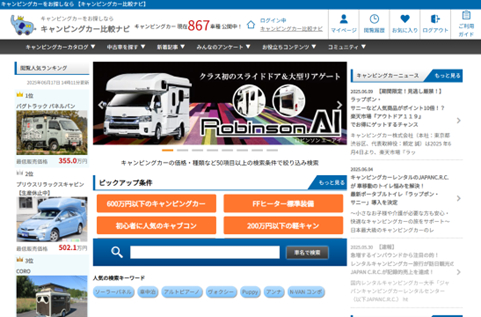 当サイトは、これからキャンピングカーの購入を検討されている方へ向けた日本最大級のキャンピングカーの比較サイトです。国内・海外を含む850台以上のキャンピングカーを、価格や車両サイズ、就寝人数やオプション装備など、約60種類の項目からスペック比較ができ、どのキャンピングカーが人気かを一定期間の閲覧数を基にランキング形式で表示。