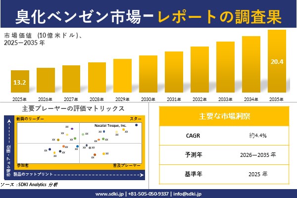 SDKI Analytics(本社:東京都渋谷区)は、このたび、2025年12月17に「臭化ベンゼン市場調査レポート:2026-2035年の市場規模、シェア、傾向の予測」を発表しました。臭化ベンゼンに関する市場調査レポートには、統計的および分析的アプローチを使用した予測評価が含まれています。この調査レポートでは、一次および二次調査方法を使用して分析された主要な業界洞察を通じて将来の傾向を理解できるようにすることで、主要な市場動向を読者に説明しています。