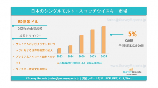 Survey Reports LLCは、2025年12月に調査レポート「日本におけるシングルモルト・スコッチウイスキー市場:タイプ別(ローランド、ハイランド、キャンベルタウン、スペイサイド、アイラ)、用途別(オンライン販売、オフライン販売)―市場分析、動向、機会および予測、2025年〜2035年」を発行したと発表した。本レポートは、日本のシングルモルト・スコッチウイスキー市場の予測評価を提供するものであり、成長要因、市場機会、課題、脅威など、同市場における複数の主要な市場ダイナミクスを明らかにしている。