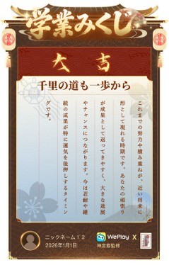 ・WePlay × 神宮館 コラボおみくじ企画: 2025年12月30日12時から2026年1月5日24時までの期間中、アプリ内で手軽に「初詣」のようなおみくじ体験を楽しめます。1日1回無料で引けるおみくじでは、「仕事・健康・恋愛・金運・学業」の5項目について、神宮館の確かな知見に基づいた運勢解説を読むことができます。