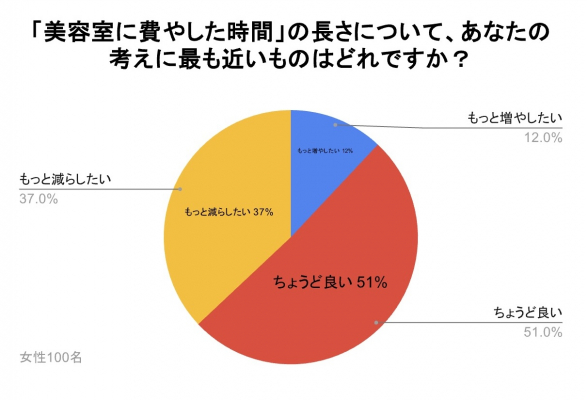 「美容室に費やした時間の長さについて、あなたの考えに最も近いものはどれですか?」の質問では、『もっと増やしたい』が12%、『ちょうど良い』が51%、『もっと減らしたい』が37%という結果となりました。
