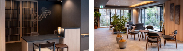 当ホームの魅力は、ホテルのように上質で充実した共用部です。古都・鎌倉を意識した和モダンなデザインの受付が、訪れる方を心地よくお迎えします。エントランスは、ガラス一面に広がる自然を望む、やわらかく温かみのある空間です。これらの空間が、ご入居者やゲストに快適なくつろぎの時間をご提供します。