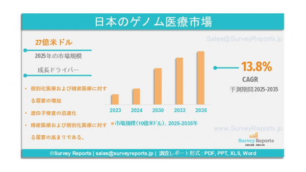 Survey Reports LLCは、2025年12月に「日本のゲノム医療市場:製品・サービス別(機器・装置、消耗品、サービス)、技術別(次世代シーケンシング(NGS)、ポリメラーゼ連鎖反応(PCR)、マイクロアレイ、サンガーシーケンシング、その他)、用途別(腫瘍学、循環器学、小児科、内分泌学、呼吸器医療、希少遺伝性疾患、感染症、その他の用途)―市場分析、動向、機会および予測(2025〜2035年)」と題する調査レポートを発行したと発表した。本レポートは、日本のゲノム医療市場に関する予測評価を提供するものであり、成長促進要因、市場機会、課題、脅威など、同市場における複数の主要な市場ダイナミクスを明らかにするものである。
