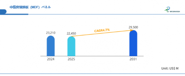 LP Information調査チームの最新レポートである「世界中密度繊維板(MDF)パネル市場の成長予測2025〜2031」(https://www.lpinformation.jp/reports/205613/medium-density-fiberboard--mdf--panels)によると、2025年から2031年の予測期間中のCAGRが4.7%で、2031年までにグローバル中密度繊維板(MDF)パネル市場規模は295億米ドルに達すると予測されている。