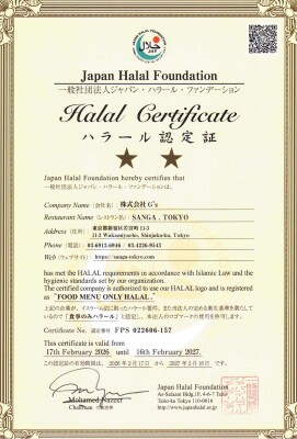 株式会社ジーズ(本社:東京都豊島区、代表取締役:本橋 優)が運営する神楽坂の和食複合施設「SANGA.TOKYO」は、2026年1月17日付で、一般社団法人ジャパン・ハラール・ファンデーションよりオールフード・ハラル認証を取得いたしました。