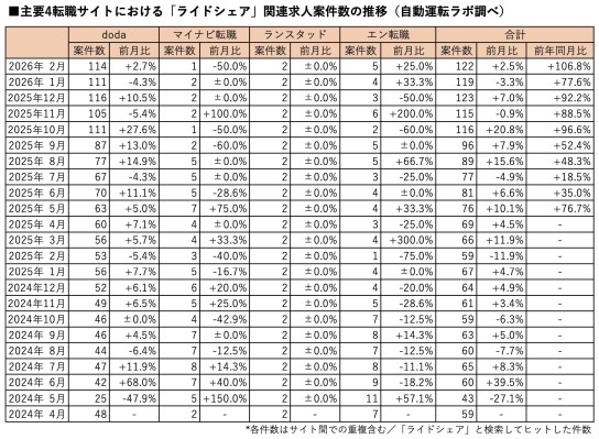 ライドシェア求人、前年同月比106.8%増の122件(2026年2月版調査)|自動運転ラボ