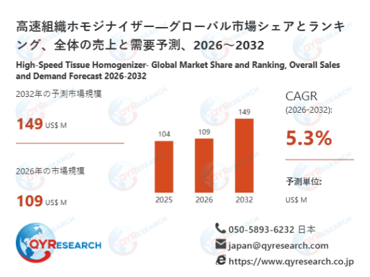 QYResearch株式会社(所在地:東京都中央区)は、「高速組織ホモジナイザー―グローバル市場シェアとランキング、全体の売上と需要予測、2026〜2032」の最新調査レポートを発表しました。