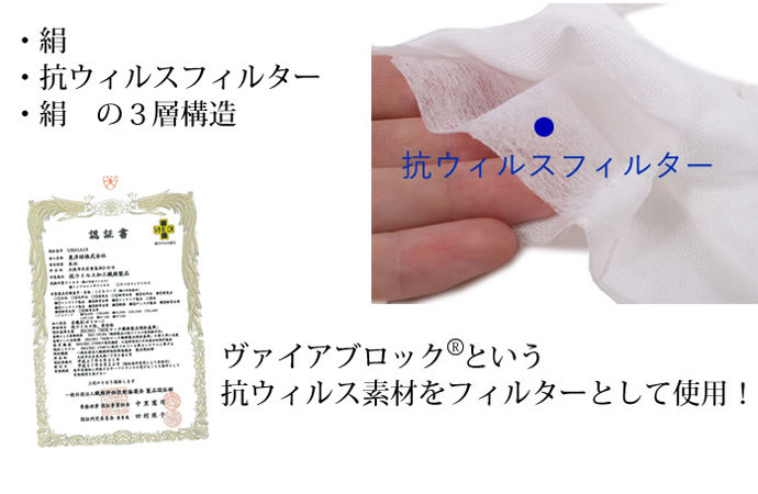 「抗ウイルス」のフィルターを採用。また、以前と同様、表・裏地の絹には「抗菌」加工を施しています。