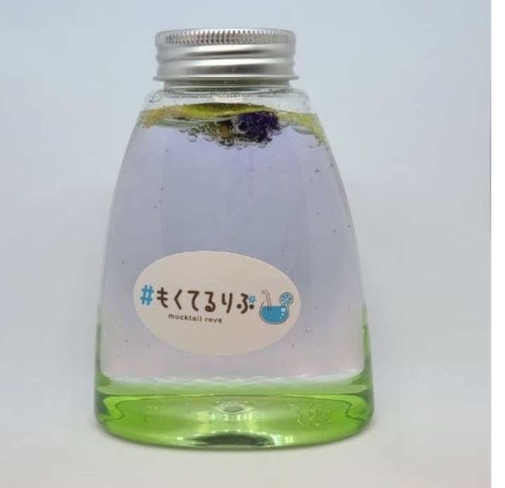 モクテルとは、英国発祥のノンアルコールのカクテルの新名称。グリーンアップルモヒートは、紫×緑のモクテル。振って混ぜ合わせると、淡ピンク、光にかざすと透明になります。二層の液体を混ぜると色が変わる、見て楽しく飲んでおいしいモクテルです。