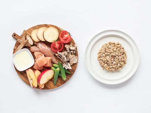 また、犬の腸に免疫細胞が集中していることから、「腸の健康維持=免疫力応援」であると考え、様々な病気予防のために消化しやすい肉や魚を主原料とし、水分量の微調整にもこだわりをもっています。食材からでる水分だけで、70%〜80%の水分を維持できるよう食材を選定しました。