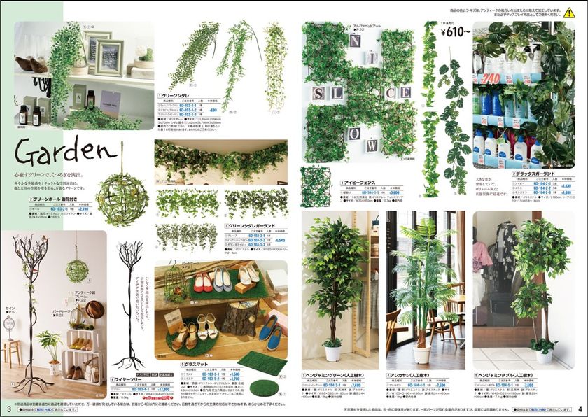 カタログでは、リース・立ち木などのグリーンアイテムや、木製オーナメント・アンティーククロック・ドール、エントランスを飾る個性豊かなマット・ボード・サインアイテムなどを多数掲載しています。またトレンドのインダストリアルテイストを取り入れたラック・サイドボード・壁掛け用サインボードや、シャビーシックイメージのチェスト・テーブル・ボレー・パーティション・テーブルが登場。アイアンのシェルフやスタンドなどの大型品、小物装飾も加わり、おしゃれなお店づくりにおすすめです。