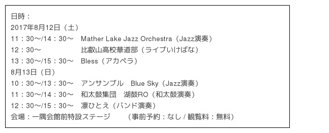 びわ湖大津にゆかりの深い太鼓やジャズなどの音楽バンドによるライブを開催します。比叡山の木漏れ日の中で身も心もすがすがしい夏の一日をお過ごしください。