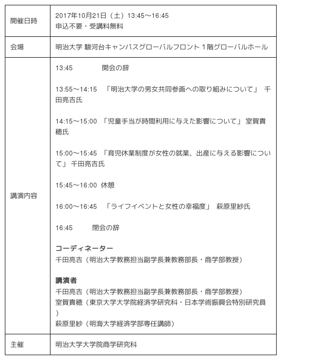 明治大学大学院商学研究科 第14回学術セミナー「ワークライフバランスの経済学―男女共同参画社会の実現を目指してー」10月21日(土)に、駿河台キャンパスで開催