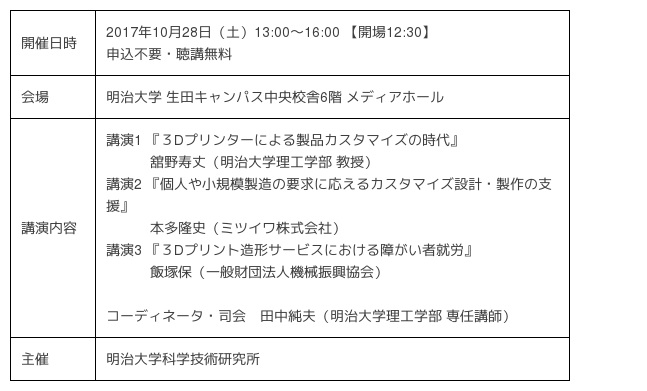 第2回 明治大学科学技術研究所 公開講演会「3Dプリンターが創る新しい製品と仕事」10月28日(土)に、生田キャンパスで開催
