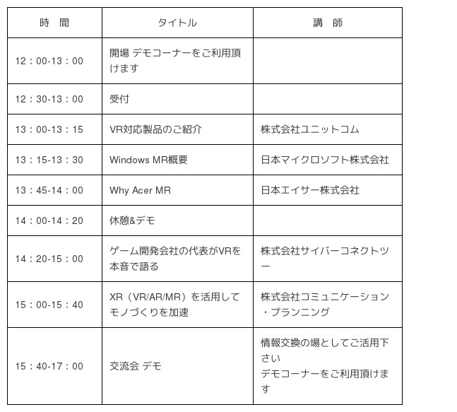 株式会社ユニットコム(代表取締役:端田 泰三、本社:大阪市浪速区)は、2018年3月20日(火)に日本マイクロソフト株式会社、テックウインド株式会社の協賛で「VRの産業利用とWindows 10 最新情報セミナー」を開催します。