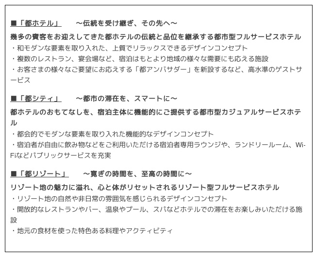 都ホテルズ&リゾーツの各ホテルを、「都ホテル」「都シティ」「都リゾート」の3つに分け、ポジショニング、施設構成や機能、サービスコンセプトなどをカテゴリーごとに明確化し、サービススタイルの違いをお客さまに分かりやすくお伝えするとともに、今後の新規展開やリニューアルの基準といたします。
