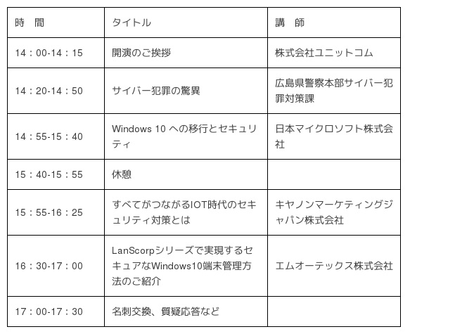 株式会社ユニットコム「Windows 10 への移行とセキュリティセミナー」を広島で2018年10月18日(木)に開催。