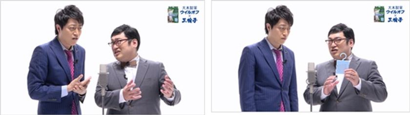 コラボシリーズ全4弾の最終コラボ漫才ムービーでは、三拍子が外出時のウイルス対策を皆さんに紹介。冒頭、三拍子にちなんだ「うがい 手洗い ウイルオフ」の掛け声とともに、ムービーがスタート。冒頭ツッコミ担当の久保(画像右)の「どんなウイルス対策をしているか?」の振りに対して、ボケ担当の高倉(画面左)が答えていき……そこから久保がお勧めのウイルス対策を高倉に教えるのだが、コンビ漫才のはずが……