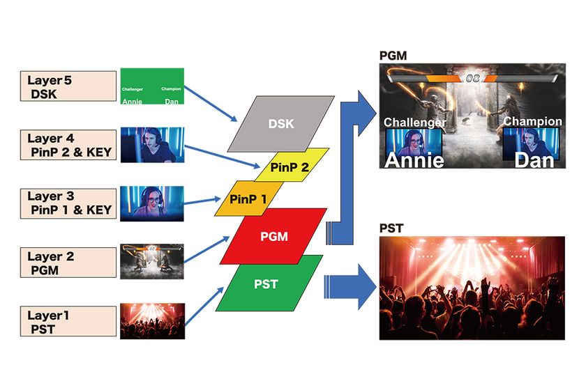 メイン映像(PGM)にプリセット映像(PST)の切り替えや映像合成、エフェクトにより多彩な映像演出を実現