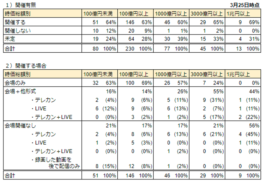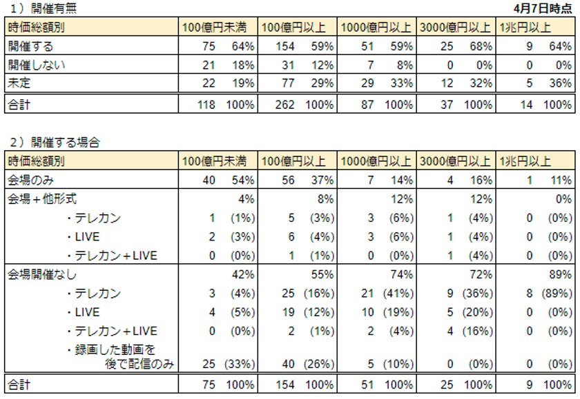 大きな傾向としては、時価総額が高くなるにつれ「開催する割合が高いが、会場開催はしない」、時価総額が低くなるにつれ、「開催しない、未定の割合が高く、開催の場合には会場開催での割合が比較的高い」ということが言えます。
