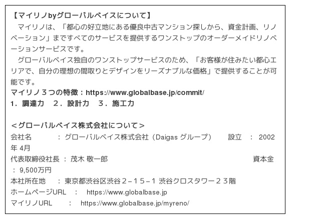 グローバルベイスのオーダーメイドリノベーション事業「マイリノbyグローバルベイス」が、都心の好立地にある優良中古マンションの調達と施工を行い、ユナイテッドアローズが内装デザインから家具製作に至るまでのプロデュースを行い、スタイルのある空間で快適な暮らしを実現します。モデルルームをご覧頂き、お客さまのご希望の立地で、ライフスタイルや趣向に応じて、間取りや設備等をアレンジしたリノベーションプランをご提供いたします。