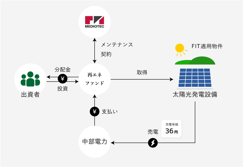 本ファンドは、匿名組合契約を通して出資者より投資して頂いた資金を元にFITを適用している稼働済み太陽光発電設備を取得し、発電した電力の売電により収益を得るファンドです。