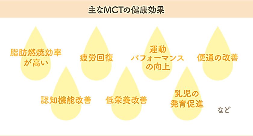 MCTとは、中鎖脂肪酸(Medium Chain Triglyceride)のことで、母乳や牛乳などの乳製品、さらにはココナッツなどのヤシ科植物の種実に含まれる成分です。一般的な食用油に含まれる長鎖脂肪酸(Long Chain Triglyceride)などと比べて、素早く消化・吸収されケトン体を生成し、エネルギーになりやすい特長があります。医療やスポーツ、生活習慣病予防など、様々な場面で世界的に利用されています。