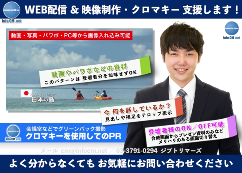 ウェビナー疑似生形式パターンにて、話に合わせた資料などを背景化から、ビデオパッケージの様な作り込みまで対応可能。内容で大きく料金が変わります。