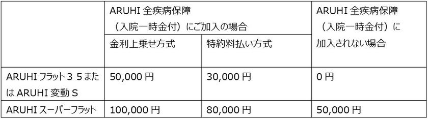 ■「ARUHI全疾病保障(入院一時金付)」は、「ARUHIフラット35」、「ARUHIスーパーフラット」、「ARUHI変動S」、「ARUHIフラットα」でご利用いただくことが可能ですが、「ARUHIフラットα」でご利用いただいた場合は本キャンペーンの対象外となります。