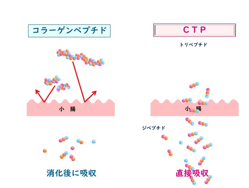 コラーゲンを経口摂取してしっかりと働かせるために、重要なのは吸収率、そして必要な部位に届けることです。ゼライスは、この2つの特性を持つ「コラーゲントリペプチド」に着目して研究開発を行っています。コラーゲンペプチドがより低分子化した、体内で有益作用を発揮する物質で、消化の過程なくそのまま吸収されるため、吸収性が非常に高く、全身の必要な組織へと取り込まれることが確認されています。