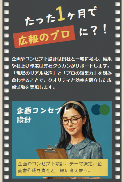 採用サイト制作、採用動画制作、インタビューコンテンツ、SNS向けショート動画などを通じて、企業の魅力を求職者にわかりやすく届けます。採用代行や採用広報と連動しながら、見せ方・伝え方まで含めて採用活動を最適化し、応募につながるクリエイティブ活用を支援します。