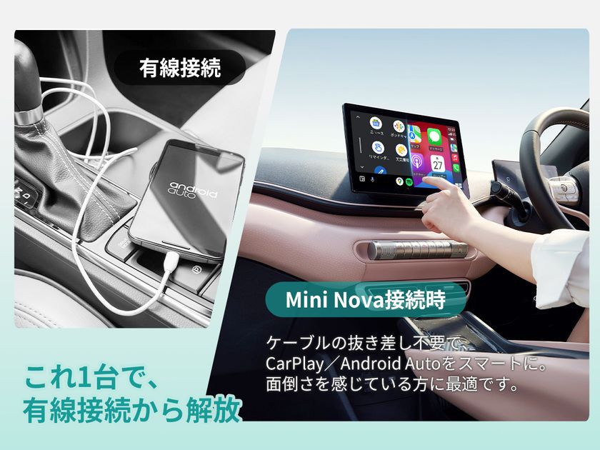 有線CarPlay/Android Autoを、簡単にワイヤレス化。アプリ不要で、すぐに使えるシンプル設計。