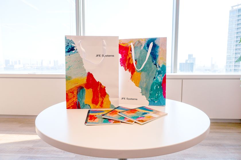 併せて、採用ノベルティ(紙袋・ノート)にもヘラルボニーのアートを採用し、採用ブランドの世界観をリアルな接点へと広げています。