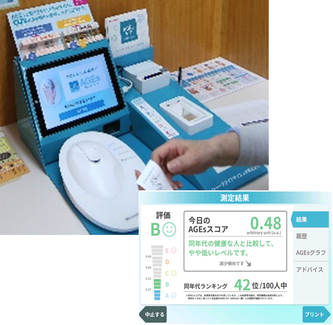 血液中の余分な糖がタンパク質と結びついてできるAGEs(終末糖化産物)という“老化物質”の量を測定します。これにより、身体の糖化(老化)の進み具合や、食事・運動など生活習慣の影響、同年代との比較などを知ることができます。AGEsが多い場合、肌のハリ低下、血管の老化、生活習慣病リスクの上昇などにつながりやすいとされています。