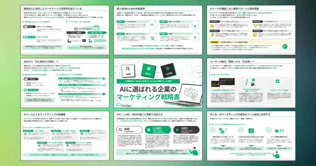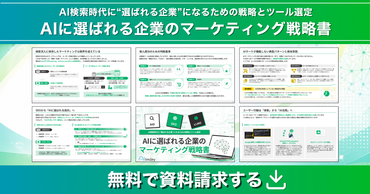 しかし、従来のチャット型AIとの違いや、実際にどのような施策に取り組めば良いのか、そして自社に合ったツールをどう選べば良いのか分からないという声も少なくありません。そこでAIsmileyは、単なる概念の紹介にとどまらず、AIに選ばれるコンテンツ設計の原則から、ツールの選定基準、失敗パターンの回避方法、そして実践的な導入ロードマップを描くための戦略書として、本資料を作成しました。