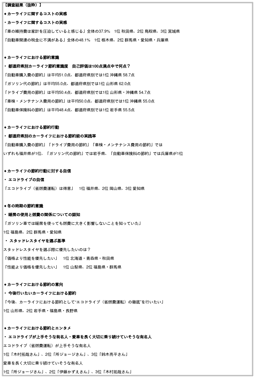 それぞれの項目について節約として行っている人の割合を都道府県別にみると、【自動車購入費の節約】では1位は福井県(57.0%)、2位は愛知県(56.0%)、3位は兵庫県と奈良県(いずれも54.0%)、【ガソリン代の節約】では1位は岩手県(70.0%)、2位は長野県(66.0%)、3位は愛知県(65.0%)、【ドライブ費用の節約】では1位は福井県(57.0%)、2位は長野県と愛知県(いずれも56.0%)、【車検・メンテナンス費用の節約】では1位は福井県(55.0%)、2位は岩手県(51.0%)、3位は長野県と沖縄県(いずれも49.0%)、【自動車保険料の節約】では1位は兵庫県(51.0%)、2位は奈良県(49.0%)、3位は新潟県・愛知県・山口県(いずれも48.0%)でした。
