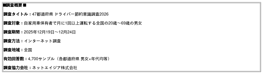 ダイレクト型自動車保険を提供する アクサ損害保険株式会社(本社:東京都台東区、代表取締役社長兼CEO:田中 勇二郎)は、自家用車保有者で月に1回以上運転する全国の20歳〜69歳の男女を対象に、「47都道府県 ドライバー節約意識調査2026」を実施し、4,700名の有効サンプルを集計し結果をまとめました。