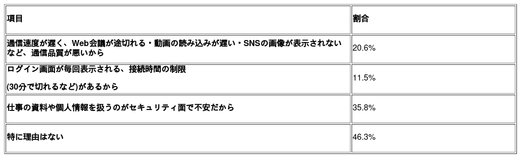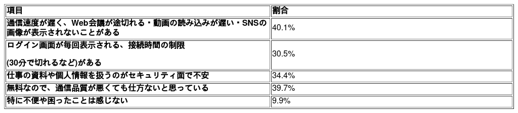 特に、通信速度や安定性といった通信品質に関する不満や、セキュリティ面への不安が挙げられており、外出先でのインターネット利用において、必ずしも快適・安心に利用できているとは言えない実態がうかがえます。