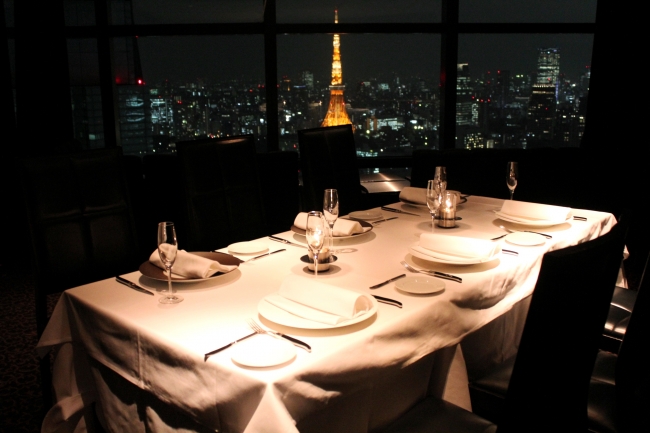 地上215mの東京随一のパノラマ夜景の中、東京タワーやお台場の夜景を見ながら世界各国よりお届けする新鮮なシーフードと、上質な和牛のステーキを楽しめます。
