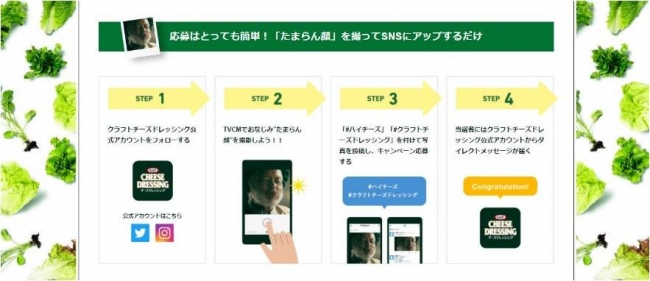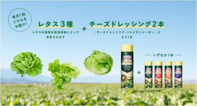 今回、この表情を“たまらん顔”と名付け、真似して写真を撮影し、Instagram、Twitterに投稿することで応募できるキャンペーンを実施。応募者の中から抽選で100名様に、レタス3種、チーズドレッシング2本とレシピを計4回、毎月種類を変えてお届けします。一般的な玉レタスやサニーレタスだけでなく、ロメインレタスやブーケレタスなど、配送時期に合わせてサラダを楽しめる旬の珍しいレタスもお届けする予定です。(※配送時期により内容は変更)チーズのこだわりが詰まった「クラフト チーズドレッシング」を、こだわりのレタスと共にお楽しみいたただけます。